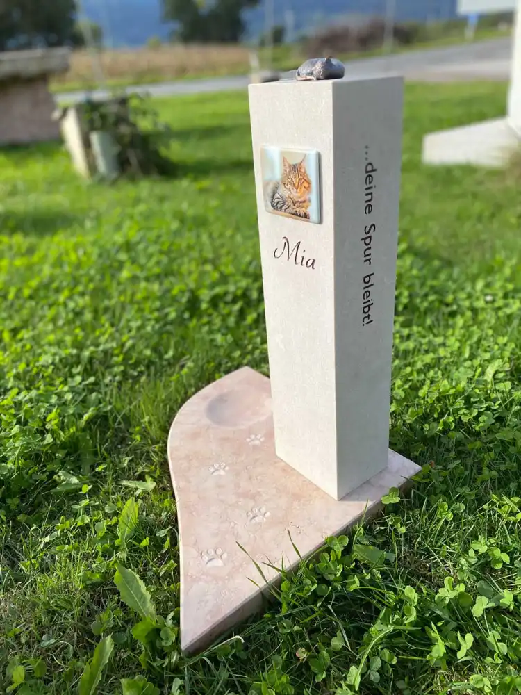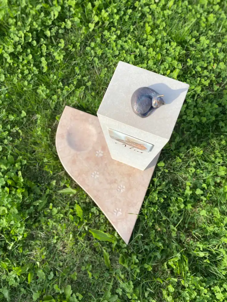 Setzen Sie Ihrem treuen Begleiter ein würdevolles Andenken mit diesem liebevoll gestalteten Tiergrabstein aus edlem Marmor. Die Kombination aus aufrechter Stele, liegender Gedenkplatte schafft einen Ort der Erinnerung – nicht nur für Sie, sondern auch für die Natur. Die Platte ist mit dezenten Katzenpfotenabdrücken verziert, die die bleibenden Spuren Ihres Tieres symbolisieren. Eine sanft eingearbeitete Mulde in der Platte dient nicht nur als optisches Element – sie ist funktional als kleine Vogeltränke gestaltet. So entsteht ein Ort des Lebens und der Begegnung, an verweilen, trinken oder baden – ein lebendiges Zeichen der Erinnerung.