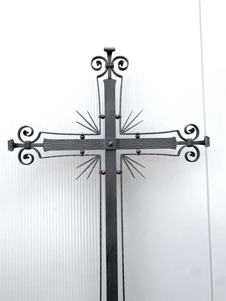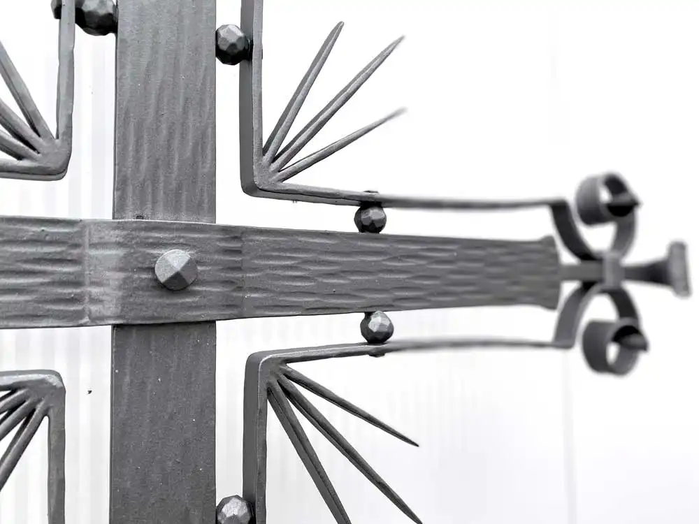 Traditionelles Schmiedeeisenkreuz mit Strahlen Dekor und dezenten Schnörkelelementen an den Enden der Kreuzarme. Klare Formensprache trifft auf feine Details – ein zeitloses Symbol des Glaubens, handgefertigt mit Sorgfalt und handwerklichem Können.