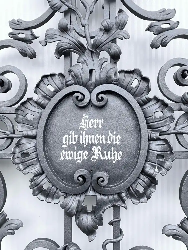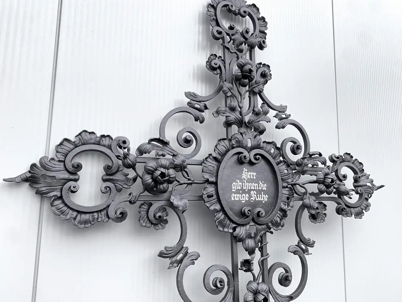 Wunderschönes Schmiedeeisenkreuz mit kunstvoll gearbeiteten Blumen- und Blätterverzierungen. In der Mitte befindet sich eine elegante Kreuztafel, die von handgeschmiedeten floralen Elementen umrahmt wird. Die Tafel trägt eine liebevoll in Weiß bemalte Inschrift.