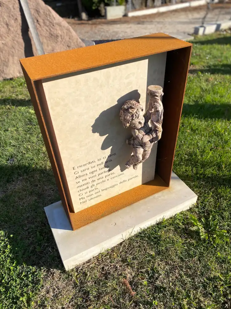 Moderner Grabstein, der edlen Marmor mit kühlem Eisen zu einer harmonischen Komposition vereint. Die schlichte Marmorplatte besticht durch ihre klare, lineare Form und wird von einem stilvollen Eisenrahmen eingefasst. Eine fein gearbeitete Engelskulptur aus Marmor sowie eine dezent gravierte Inschrift verleihen dem Denkmal eine besondere Ausdruckskraft und zeitlose Eleganz