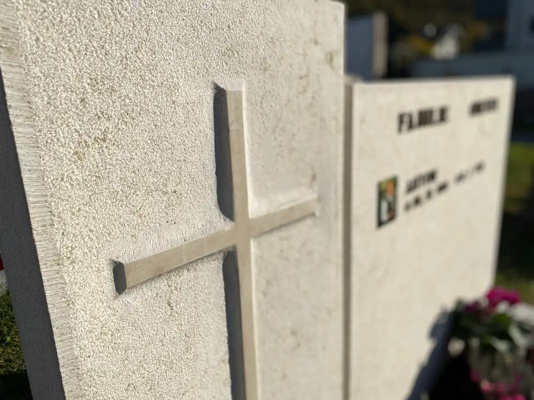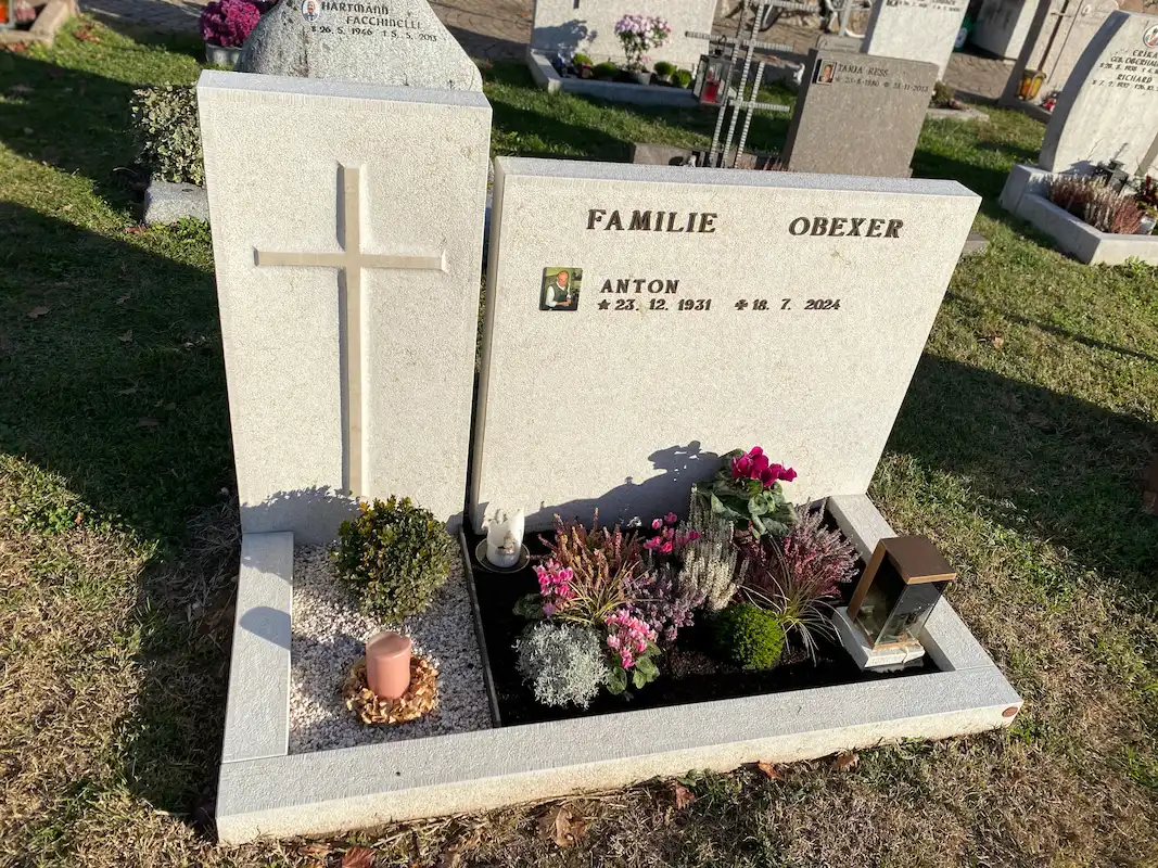 La lapide è composta da due lastre separate in calcare chiaro. Sulla lastra di sinistra è scolpita una croce, mentre la lastra di destra funge da campo per l’iscrizione, sulla quale il nome del defunto è riportato in semplici lettere di bronzo. Il design è completato da una lanterna in bronzo abbinata, integrata nell’insieme del monumento su un basamento in pietra separato.