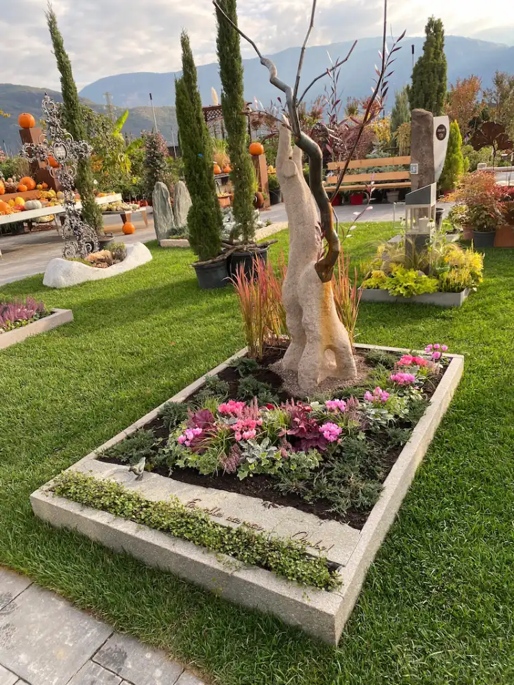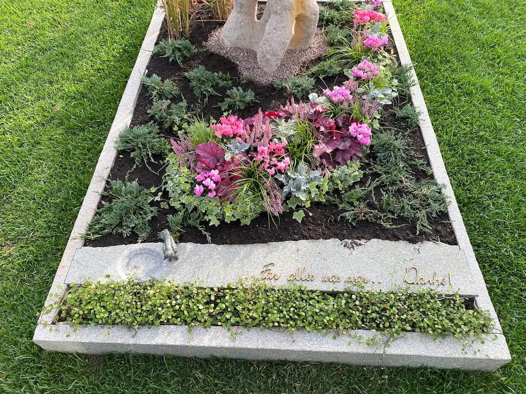 Una lastra di pietra al naturale è incisa con lettere in bronzo e impreziosita da una piccola acquasantiera ricavata nella pietra e da un uccellino in bronzo, aggiunto con particolare attenzione ai dettagli.